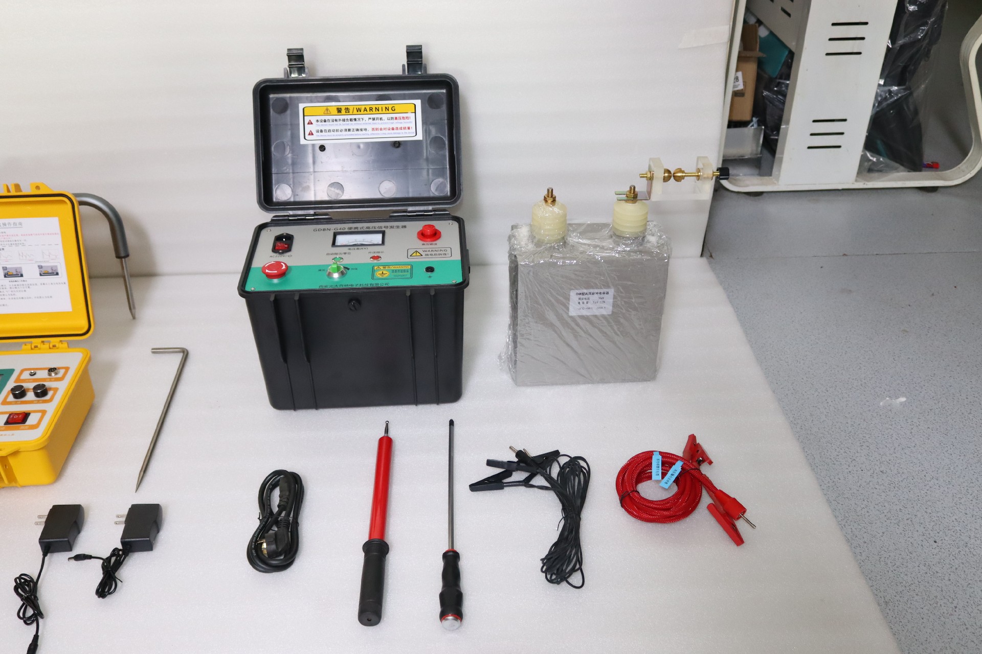 接著連接高壓線纜,從設(shè)備高壓端口至電容另一極、從球隙至故障電纜;最后仔細(xì)檢查連線是否有誤,檢查無誤后插上電源線。