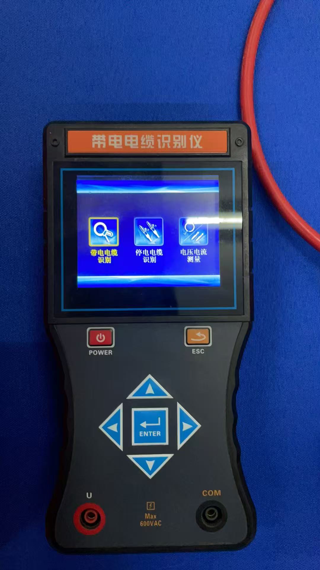 接收機(jī):為手持設(shè)備,3.5寸彩色液晶屏,內(nèi)置高速微處理器,結(jié)合精準(zhǔn)算法,對(duì)發(fā)射機(jī)的脈沖編碼電流信號(hào)進(jìn)行識(shí)別并解碼,同時(shí)具有信號(hào)強(qiáng)度標(biāo)定功能,顯示信號(hào)強(qiáng)度和檢測(cè)結(jié)果,精美直觀;彩色刻度條動(dòng)態(tài)顯示,一目了然,電纜識(shí)別成功打√,非目標(biāo)電纜打×,能快速自動(dòng)識(shí)別目標(biāo)電纜。同時(shí)可測(cè)試電壓量程為AC 0.00V~600V(50Hz/60Hz),可測(cè)交流電流量程為AC 0.00A~5000A(50Hz/60Hz),可測(cè)電流頻率45Hz~70Hz。